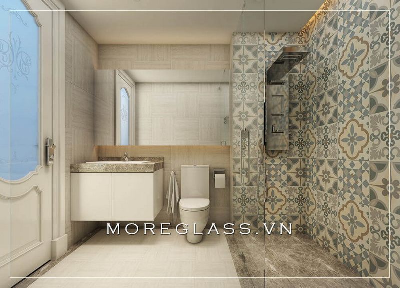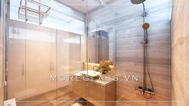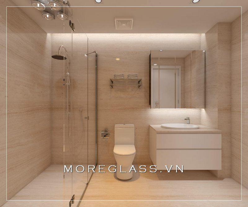 Khách sạn có phòng tắm kính được trang bị thiết bị vệ sinh hiện đại và đơn giản, kết hợp với sự sáng tạo của gam màu trắng và vàng ấm, đã trở thành một trong những thiết kế phòng tắm được ưa chuộng nhất hiện nay.