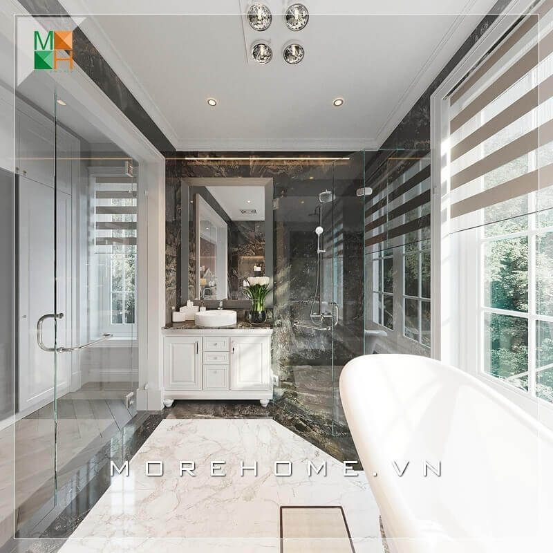 Để làm cho phòng tắm của biệt thự, nhà phố có thêm một vẻ sang trọng, sử dụng đá ốp lát và vách kính ngăn hiện đại.